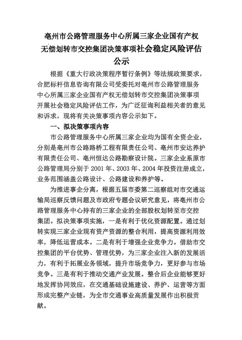 亳州市公路管理服務(wù)中心所屬三家企業(yè)國(guó)有產(chǎn)權(quán)無(wú)償劃轉(zhuǎn)市交控集團(tuán)決策事項(xiàng)社會(huì)穩(wěn)定風(fēng)險(xiǎn)評(píng)估公示